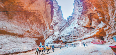 10月31日,位于新疆维吾尔自治区阿克苏地区的库车大峡谷国家地质公园内,游客在红层峡谷里观赏冰川遗迹、雅丹地貌等景观。