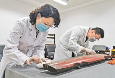 辽宁省博物馆工作人员在对九霄环佩琴进行保养。九霄环佩琴制作于唐代。在古琴琴底,镌刻着“九霄环佩”四个字。琴面上,镶嵌着13个由蚌壳制成的圆点,起到标记琴弦音位的作用。 |