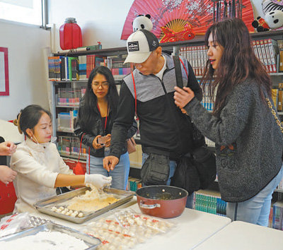 当地时间11月7日,在位于秘鲁首都利马的里卡多·帕尔玛大学孔子学院,中秘两国记者在了解中国小吃藕丝糖的制作工艺。 |