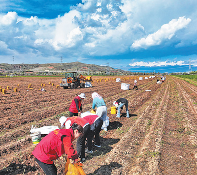 青海省海东市互助土族自治县把“党建+志愿服务”模式作为党建引领乡村治理的切入点和突破口,充分发挥党员示范引领作用,大力弘扬志愿服务精神,打通服务群众的“最后一公里”。图为互助县卓扎滩村的党员和青年志愿者在帮助村民抢收马铃薯。