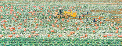 近年来,安徽省亳州市蒙城县大力发展蔬菜生产,通过培育蔬菜产业链,有效带动农民增收,助力乡村全面振兴。图为11月20日,蒙城县板桥集镇双鹿村田间,农民使用机械搬运刚采收的甘蓝,准备运往市场销售。