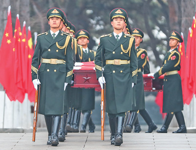 上午10时,军乐队奏响婉转低回的《思念曲》,在解放军仪仗司礼大队战士持枪护卫下,礼兵护送志愿军烈士棺椁缓步进入纪念广场,全场奏唱中华人民共和国国歌。致祭文后,全体人员向烈士三鞠躬,27名礼兵连续鸣枪12响,向志愿军烈士致以崇高敬意。