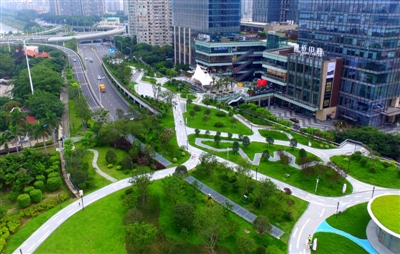 6月5日,空中鸟瞰福州市江滨路上空5万平方米的“空中公园”。该公园将200亩的闽江公园“滨江森林”和87亩的市民广场“城市绿谷”连为一体,形成总面积超过20万平方米的“现代城市绿肺”,并与中央商务区内的福州市图书馆、融侨中心、福州国际金融中心、三迪联邦中心相接,打造形成现代城市生态商务景观区。