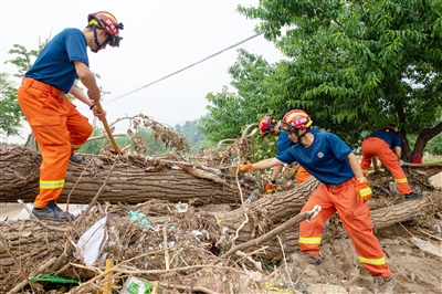 随着洪水逐渐退去,京津冀各受灾地区在进行抢险救灾的同时积极展开灾后重建。各地通信、交通等正在逐步恢复,大量受灾群众被转移安置,生产生活秩序正在加快恢复。图为8月10日,北京市门头沟区八奇洞景区,消防员正在清理杂物。