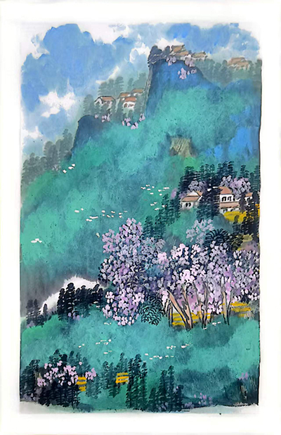 看王建树的山水画,我能够感受到他内心追寻的那种壮阔之美。这种壮阔之美不仅体现在他对自然山水的表现形式上,也体现在他对地域精神气度的深度挖掘中。他常深入黄土高原、秦巴山脉等地进行采风。每到一地,首先感受的是大山莽原的壮阔,然后钻进当地,细致感受历史的厚重及多彩的人文。王建树从来不是完全停留在一个自然景观的表象上面,他会通过体验和感受,抓住自然景观的内涵,然后通过绘画手法进行个性化转换。