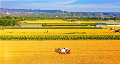 当前,山西省运城市夏县播种的冬小麦陆续进入成熟收获期,广阔的田野上麦浪滚滚,机声隆隆,一派丰收繁忙景象。