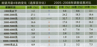 调查显示,今年学生期望月薪处于较低水平段(2000元以下)的人数百分比高于以往,近30%;在3000元以下的水平段上,人数比例开始下降;在8000元以上水平段变化尤其明显,继2006年和2007年在分别跌至5.1%和3.3%后,2008年跌到了2.1%的最低点。