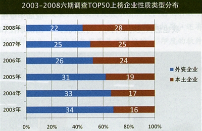 《中国经济周刊》记者了解到,继2007年国内企业与外资企业平分秋色之后,国内企业今年首次超过外资企业,在TOP5的名单中,前4名均为国内企业,在TOP50榜单中,国内企业占据28家,外资企业22家。这与2003年TOP50榜单中只有16家国内企业上榜明显显示出国内企业已经日趋占有优势。据统计,在上榜的50强企业中,学生选择国内企业的比例大大提高,2008年有近1/4的学生将国有企业作为求职首选。