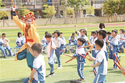 “英歌舞表演的是什么桥段?”“这个红脸谱的就是擅使青龙偃月刀的关羽吗?”英歌舞还未跳罢,孩子们就忍不住发问。在随后的“名著品读”环节,志愿者结合英歌舞的历史渊源,讲述《水浒传》中“梁山好汉营救卢俊义”“武松打虎”等经典故事。孩子们听得入了迷,弘扬文化、建设家乡的想法也悄然升起。“我想像青年英歌队的哥哥们一样,用自己喜欢的方式让家乡变得更酷!”一年级的小学生蔡乔晔说。