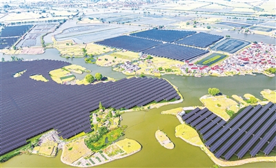 图为泰州市海陵区华港镇下溪村的“渔光互补”光伏发电项目。