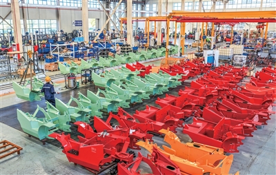近日,在安徽马鞍山市郑蒲港综合保税区,工人正在生产线上赶制新能源智能叉车,以满足海外订单需求。