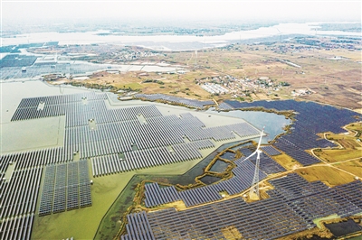 在江苏省泗洪县天岗湖浅水滩,光伏设备整齐排列,蔚为壮观。