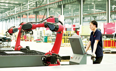 5月14日,位于江苏省宿迁市沭阳县经开区的江苏通强股份有限公司车间,工人在操作智能生产设备生产新能源汽车金属零部件。